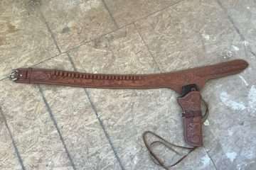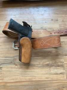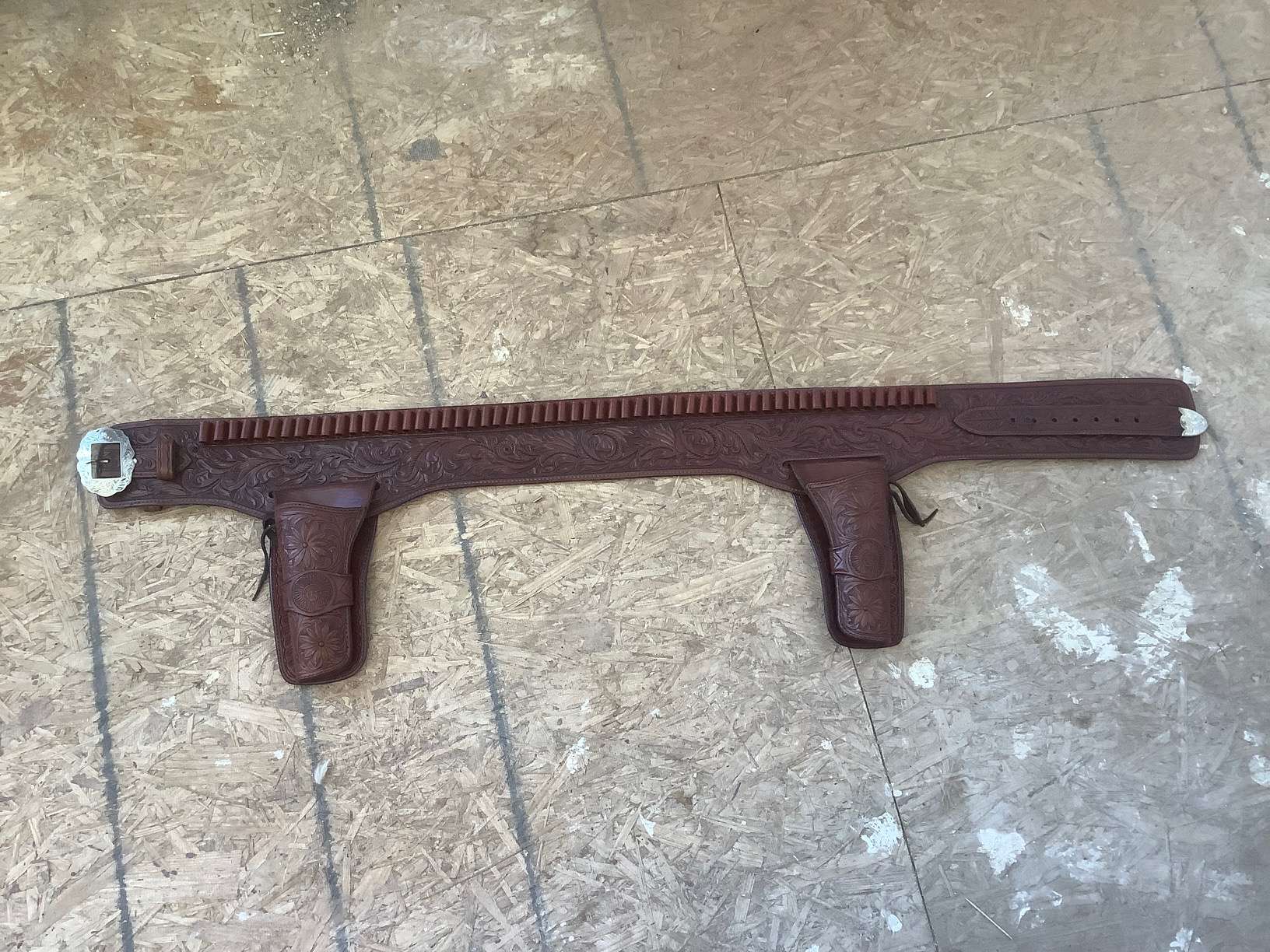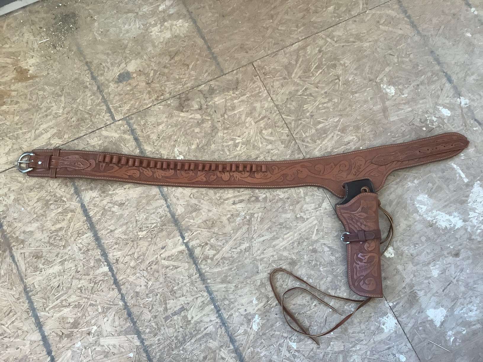 The belt size 40-45″ (fits 35-40″ waist). The holster is suede lined. Belt and holster are both carved. The holster fits a Colt single action, 7 1/2” barrel.