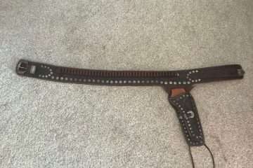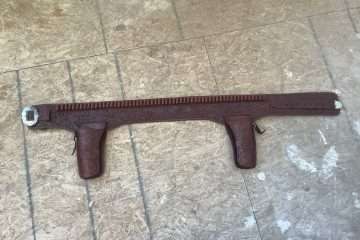 This rig is fully carved and has the Indian heads carved on the holster loops. More pictures available. The holsters were made for Colt single action, 5 1/2” barrels. Sterling silver buckle. The belt size 40-45″ (fits 35-40″ waist). 45-caliber bullet loops. New condition. Made by Wm. Brown Holster Co.