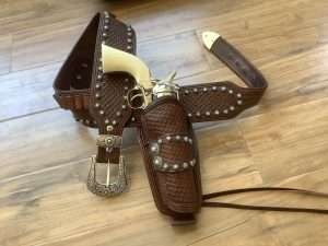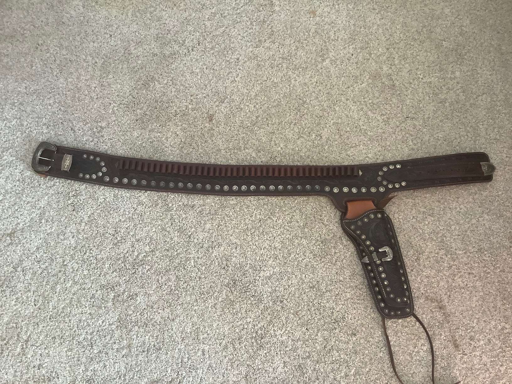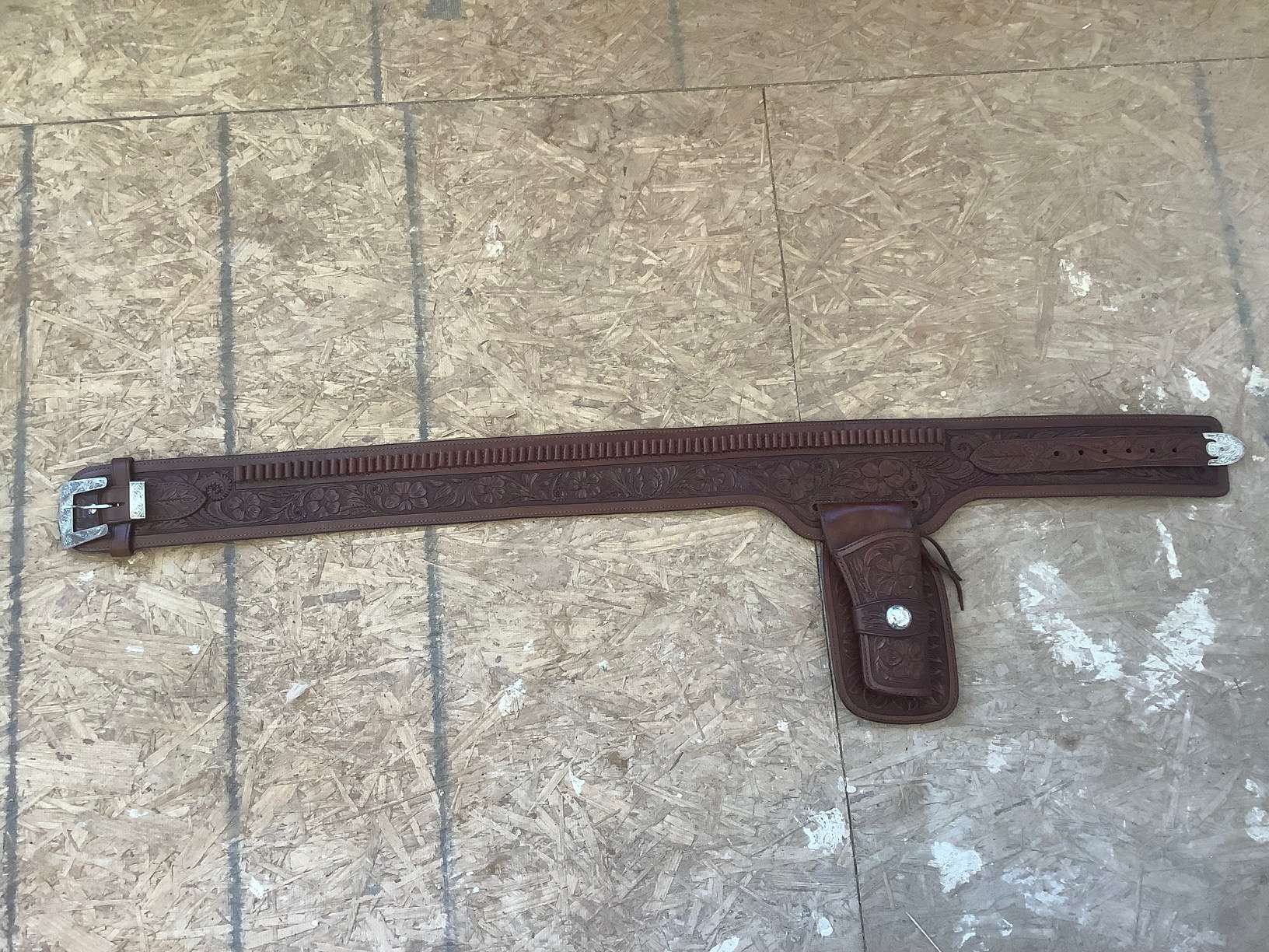 This rig was made by Bianchi and comes with a certificate from Bianchi. It is a carved, single holster for a Colt single action pistol, 7 1/2” barrel. The buckles and spots are sterling silver. The belt size 40-45″ (fits 35-40″ waist).