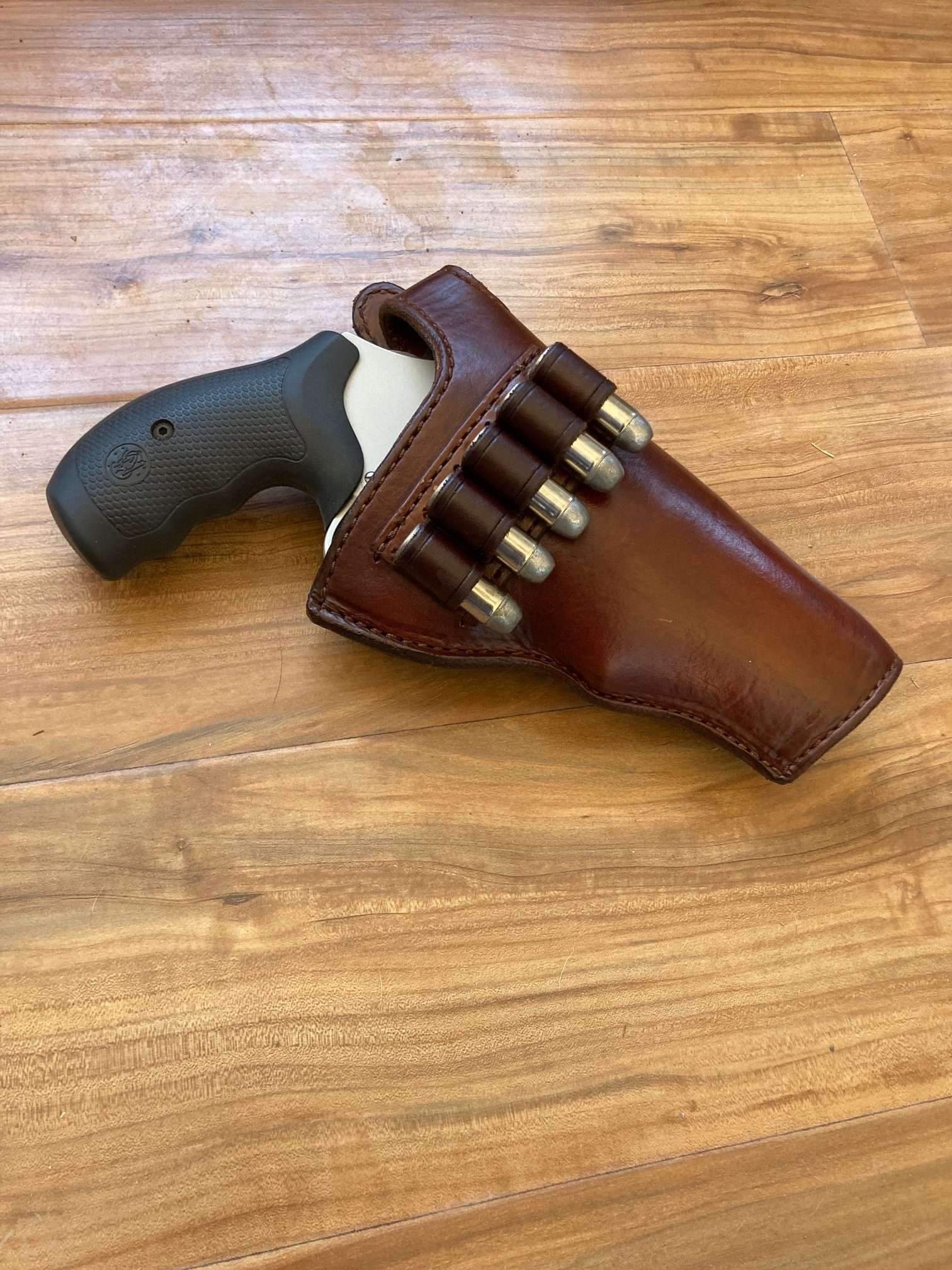 410 and 45 caliber. Lined holster, thumb break, belt loop.